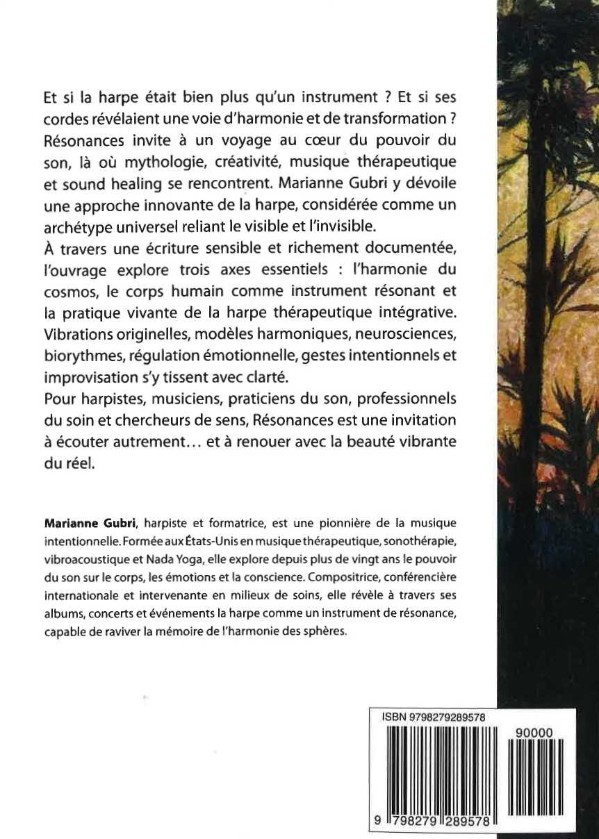 RÉSONANCES : Et si la harpe était bien plus qu’un instrument ? Et si ses cordes révélaient une voie d’harmonie, de conscience et de transformation ? Résonances – La harpe, voie d’harmonie et de transformation invite à un voyage unique au cœur du pouvoir du son. Entre mythologie, créativité, musique thérapeutique et pratiques de sound healing, Marianne Gubri propose une approche profondément innovante de la harpe, conçue comme un archétype universel capable d’unifier le visible et l’invisible. Un ouvrage de référence, à la fois poétique, clair et profondément vivant. Une invitation à écouter autrement… et à renouer avec la beauté vibrante du réel. Fruit de plus de vingt-cinq ans de recherche, de pratique et d’expérience clinique internationale, ce livre propose une vision renouvelée et profondément humaine de la musique : une musique intentionnelle, qui relie, apaise, régule, élève et transforme. Destiné aux harpistes, aux musiciens, aux praticiens du son, aux professionnels du soin, ainsi qu’à toutes les personnes en quête de sens, Résonances offre un modèle inspirant et novateur pour faire du son un chemin d’évolution personnelle et professionnelle. Entre sagesse ancienne, recherches contemporaines en musicothérapie, médecine intégrative et exploration créative, il révèle comment la harpe peut devenir un véritable instrument d’harmonie – pour soi, pour l’autre, pour le monde.